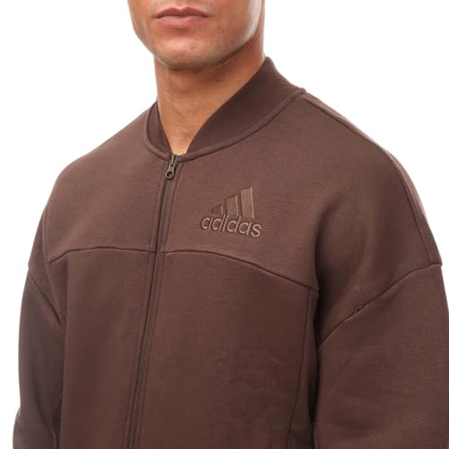 Mens adidas Studio Lounge Fleece Track Top in brown.> Ribbed bomber collar.> Full zip fastening.> Side pockets.> Ribbed cuffs.> Partially ribbed hem.> Fleece.> Regular fit.> Main Material: 70% Organic Cotton 30% Polyester (Recycled). Rib Part: 100% Cotton.> Ref: HU1784