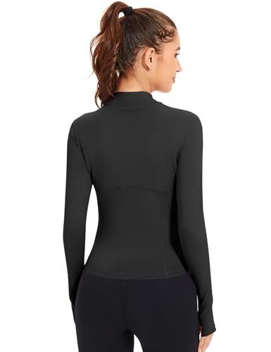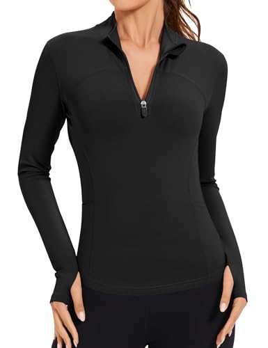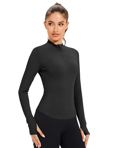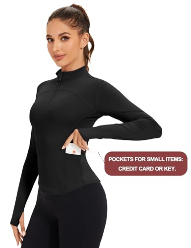 IECCP Women’s Gym Tops 1/4 Zip Long Sleeve Quick-Dry Sports T-Shirts Lightweight Athletic Activewear with Thumb Holes, Side Pockets for Yoga, Running