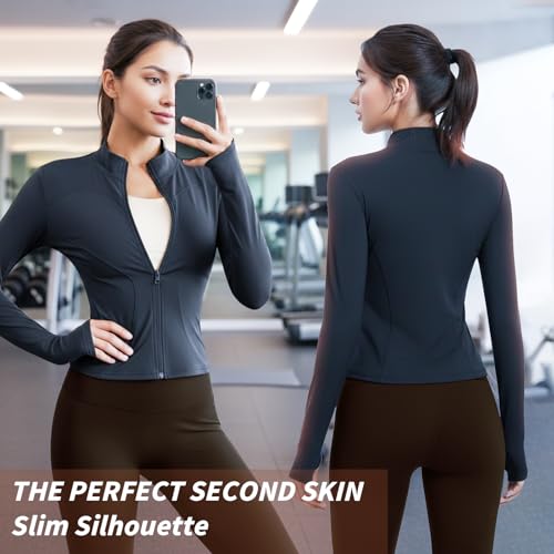 Womens Running Gym Jackets, Zip Up Long Sleeve Sports Tops, Slim Activewear with Thumb Holes for Ladies Fitness Workout Yoga