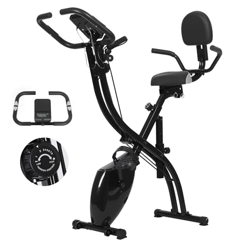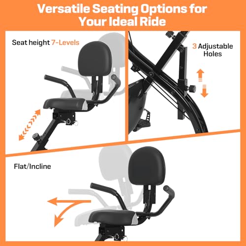 4-in-1 Design with Adjustable Seat & Arm Bands: The ergonomic seat offers 3-way adjustment: tilt angle, seat height, horizontal position (forward/backward) to accommodate different body types. Foldable exercise bike combines multiple exercise modes in one, supporting high intensity fat burning, low intensity stretching and strength training. Equipped with arm resistance bands help better improve upper body and leg strength.
