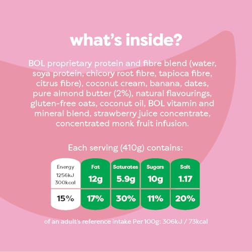 BOL proprietary protein and fibre blend (water, soya protein, chicory root fibre, tapioca fibre, citrus fibre), coconut cream, banana, dates, pure almond butter (2%), natural flavourings, gluten-free oats, coconut oil, BOL vitamin and mineral blend, strawberry juice concentrate, concentrated monk fruit infusion. BOL Vitamin and Mineral Blend: Minerals (Chloride, Calcium, Potassium, Phosphorus, Magnesium, Iron, Zinc, Copper, Manganese, Selenium, Chromium, Molybdenum, Iodine), Vitamins (A, C, K, Niacin, E, Pantothenic Acid, D, B6, Riboflavin, Thiamin, Folate, Biotin, B12), Choline.