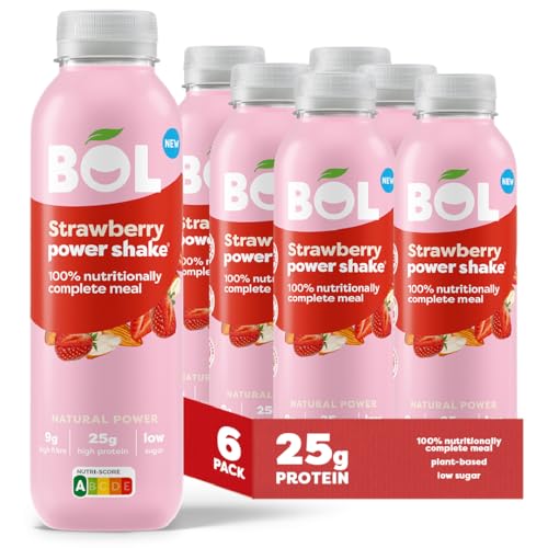 BOL Strawberry Power Shake – Ready-to-Drink Nutritionally Complete Meal (300Kcal) | 25g High Protein Shake | Low Sugar, High Fibre (9g), Plant-Based, Low Calorie Meal Replacement (410ml x 6 Bottles)