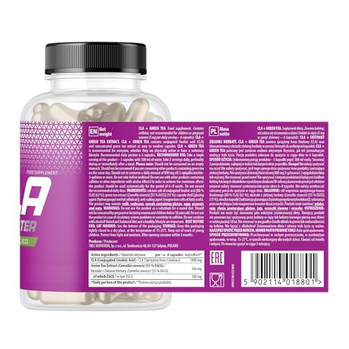 Effective Weight Management Support: Trec Nutrition CLA + Green Tea combines the power of conjugated linoleic acid and green tea extract to create a potent formula for those seeking to enhance their weight loss journey. CLA is a natural fatty acid known for supporting fat metabolism, while green tea extract is rich in antioxidants that may boost metabolism and increase fat oxidation. Together, they offer a synergistic effect to help you achieve your fitness and weight management goals.