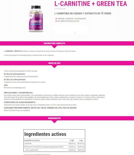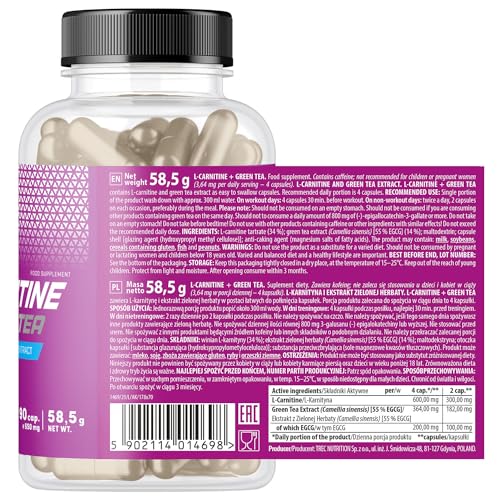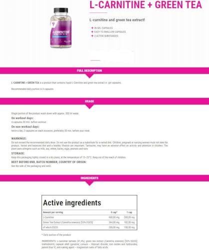 Trec Nutrition L-Carnitine + Green Tea Extract Fat Burner Sport Bodybuilding 90 Capsules is a product that contains very absorbable liquid L-carnitine and concentrated green tea extract enclosed in gel capsules. L-Carnitine supports the process of generating energy from fat. During training, the body primarily takes the energy it needs from the excess fat tissue and in this way effectively burns even the fat that is the hardest to get rid of. The active ingredients contained in the product also participate in the metabolism of carbohydrates and certain branched chain amino acids. In addition, they increase endurance during training, promote regeneration, reduce body weight and shape the body. However, they do not cause any negative effects. What is L-Carnitine? L-Carnitine is synthesized from the amino acids lysine and methionine and fulfils essential functions in human metabolism. The naturally occurring protein compound acts as a receptor molecule for various fatty acids and thus contributes to an effective one The fact that long-chain fatty acids can only be transported into the interior of energy-producing mitochondria with the help of L-carnitine plays an important role in this, making carnitine particularly suitable as a fat burner – can improve fat burning and help you lose weight – Can enable better energy release (recommended for mental performance requirements) – Improves regeneration after sports. Comes 90 capsules in a jar.