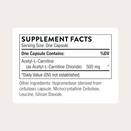 Thorne Acetyl-L-Carnitine: Each capsule contains 500 mg of Acetyl-L-Carnitine (Chloride) per serving (1 capsule). The product is packaged with 60 servings per container