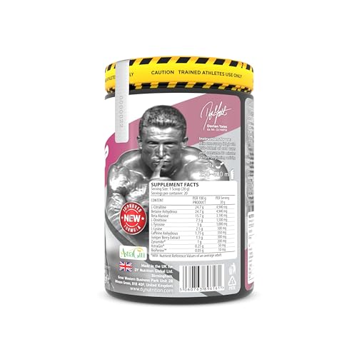 L-Citrulline, Betaine Anhydrous, Beta Alanine, L-Ornithine, Acidity Regulator (Citric Acid), L-Tyrosine, Flavouring, L-Lysine, Anti-Caking Agent (Silicon Dioxide), Caffeine Anhydrous, Juniper Berry Extract, Colouring (Red Beetroot Powder, E129*), Zynamite, Sweetener (Sucralose), Astragalus Membranaceus Root and Panax Notoginseng root (as AstraGin®), Black Pepper Extract (as BioPerineTM).