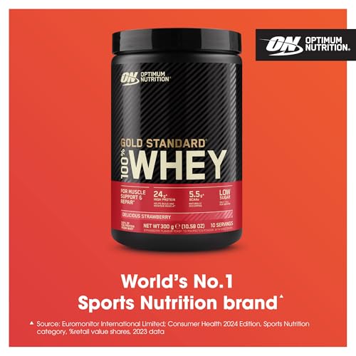 Optimum Nutrition Gold Standard 100% Whey Muscle Building and Recovery Protein Powder with Naturally Occurring Glutamine and BCAA Amino Acids, Delicious Strawberry Flavour, 10 Servings, 300g