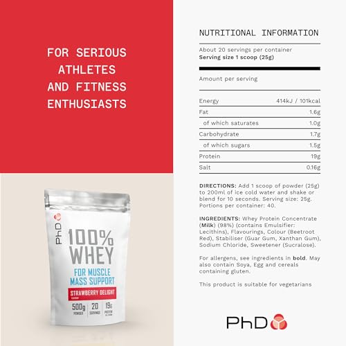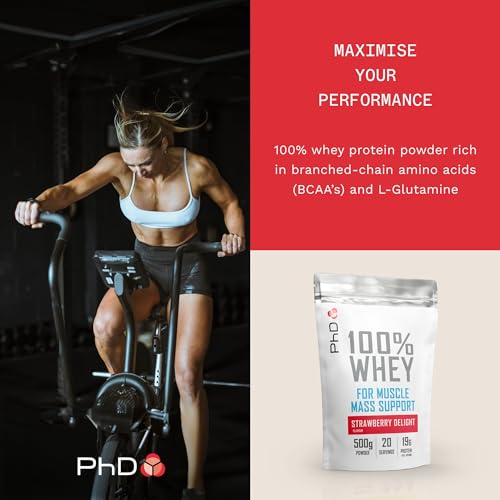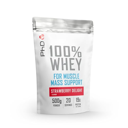 PhD Nutrition 100% Whey Protein Powder, Grass Fed Whey Protein, Rich in Amino Acids & L-Glutamine, Low Calorie Protein Powder Strawberry Delight, 20 Servings, 500g