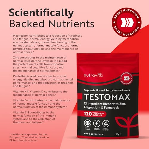 Nutravita TESTOMAX Testosterone Booster for Men – 13 Powerful Active Ingredients & Vitamins Including Zinc, Maca Root Extract, Fenugreek, Ginseng – Made in The UK