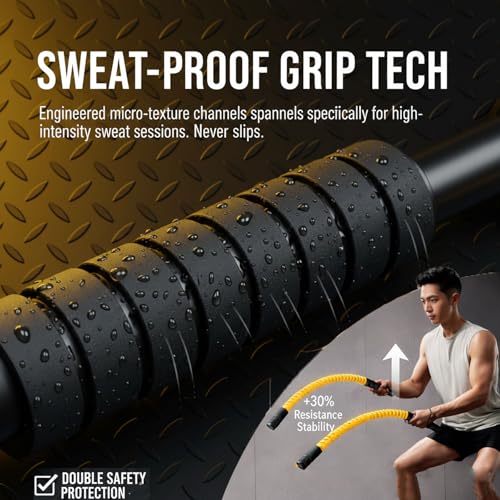 BREATHABLE & SWEAT-WICKING GRIP Safety is paramount during intense workouts. The Battle Rope handle is engineered with a specialized breathable texture that effectively wicks away sweat, ensuring a secure, non-slip hold. No more worrying about the bar slipping from your hands during a “1-minute sweat session.” The included safety wrist straps provide double protection for peace of mind.