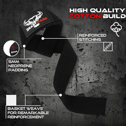 BEAST RAGE Weight Lifting Straps Fitness Padded Cotton Wrist Support Gel Advanced Grips Dumbbell Bar Wraps Heavy Duty Gym Bodybuilding Straps Power Deadlift Barbells Non Slip Exercise