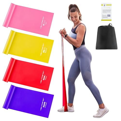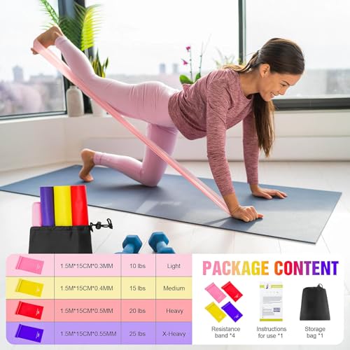 What you get: Four different resistance levels of 1.5 meters fitness bands: Pink (0.3 mm/10 lbs); Yellow (0.4 mm/15 lbs); Red (0.5 mm/20 lbs); Purple (0.55 mm/25 lbs). Whether you are a beginner, inexperienced user or professional, you can easily adjust your training according to your strength characteristics, muscle flexibility and comfort. It is very suitable for yoga, pilates, physiotherapy, body shape training, strength training, Crossfit, chair training, rehabilitation