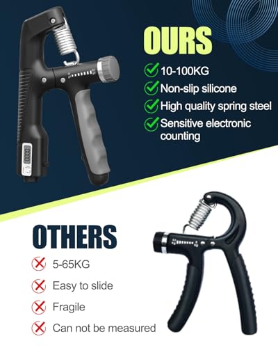 10-100kg Adjustable Resistance Levels: With a wide range of 10-100kg, our hand grip strengthener provides customizable resistance levels to meet your specific needs. Made with stainless steel and non-slip silicone grips, our forearm strengthener set ensures durability, safety, and comfort during your training sessions. Whether you’re a beginner or an experienced trainer, our adjustable hand gripper is suitable for everyone, allowing you to progress at your own pace