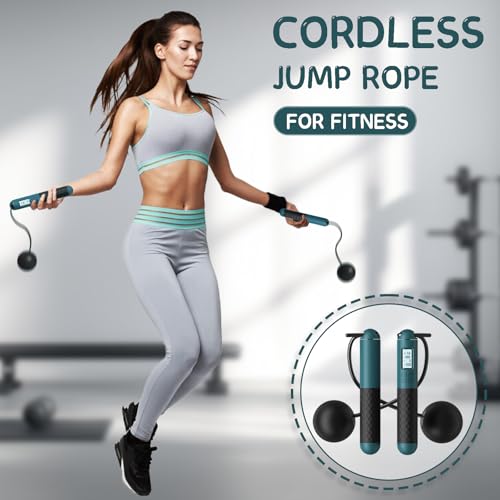 Cordless Skipping Ropes Ropeless Skipping Rope with Counter Wireless Jump Rope with Weighted Balls Portable Digital Fitness Training Equipment for Home Gym for Adults and Teens(DarkGreen)