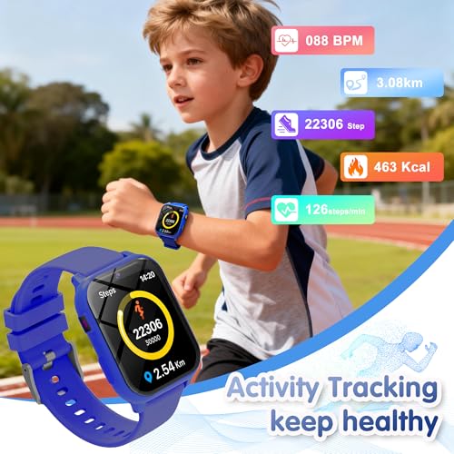 【All Day Activity Tracking】kids smart watch fitness tracker can accurately record activity steps, exercise distance, and calorie consumption, including running, walking, cycling, basketball, yoga, soccer, and more, allowing for a clear view of kid’s activity levels. Whether running or climbing stairs, data can be viewed directly on blue kids watch, capturing real-time activity status and ensuring the healthy growth of children youth