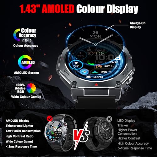 Jugeman Outdoor Smart Watch for Men with GPS & Call, 1.43″ AMOLED Rugged Fitness Smartwatch, Heart Rate & Blood Oxygen Monitor, 5ATM Waterproof, 160+ Sports Smart Watch, Compatible with iOS Android