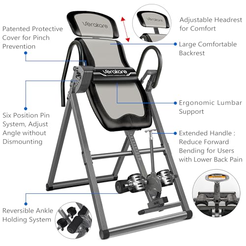The Verakare ITX9550 is a heavy-duty inversion table that comes with many new features that set it apart from other inversion tables. Starting with its large backrest, adjustable headrest, and soft touch foam handlebars, it provides a comfortable, easy inversion. But these are just the basics. The ITX9550’s True Balance System allows each user to find their own unique center of gravity. The Six Angle Pin System allows users to trust that the ITX9550 will easily, safely, and consistently deliver on the finest inversion experience. True Balance System – Triple Adjustment Structure Unlike other inversion tables, which only have one adjustable part, the ITX9550’s True Balance System has three adjustable features, to help each individual user find the smoothest and most comfortable inversion experience for them. The True Balance Structure allows users to adjust the headrest, the height, and the footrest to micromanage the center of gravity. The 6-Angle Pin System with Protective Cover The ITX9550 also includes a patented protective cover for the easy to adjust six angle pin system. Just position the pin in the desired slope and know that your inversion position will be safe, comfortable, and consistent every time. Old tether strap systems require the user to dismount entirely and climb underneath the table in order to adjust and can loosen after repeated use. Disclaimer: inversion tables are intended to provide immediate and lasting back relief, but may not work for all customers, we cannot guarantee pain relief with the purchase of this product Safety Information: Consult with a licensed physician before using this inversion table. Some medical conditions may not be suitable for use with this product. Disclaimer: Although we strive to ensure all product details and information is accurate, there may be slight variations by the manufacturer. Actual product packaging and materials may vary and may contain different information than shown on our product page or website. Please do not rely solely on the information presented and be sure to read all labels, warnings, and instructions before using the product. For additional information on the product, please do not hesitate to contact the manufacturer.