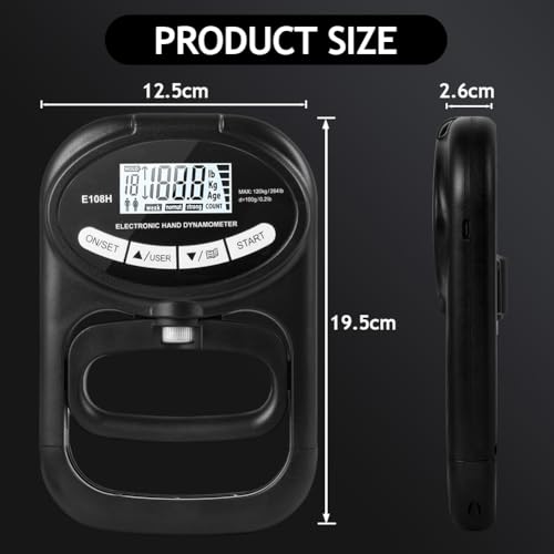 Accurately and precisely measures grip strength from 0 to 264 lbs (120 kg): This handheld strength meter features a high-precision strain gauge sensor that gives you an accurate, instant digital reading of your grip strength. Measurement range: 0 to 264 lbs (120 kg) grip strength.