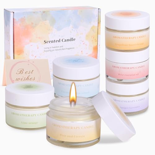 SCENTED CANDLES : Candles gifts set for women have 6 kinds of different scents:Rose essential oil,Lime orange,Coconut breeze island,Pear and Freesia,Grapefruit sweet Orange,Juniper Lavender.One purchase to enjoy 6 different fragrances