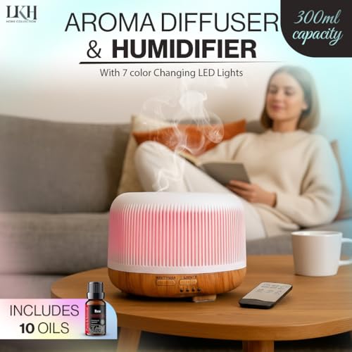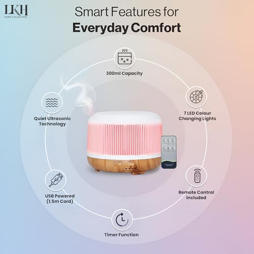 LKH Aroma Diffuser & Humidifier 300ml with Remote & Timer – Aromatherpay Ultrasonic Mist 10 Essential Oils Diffuser – LED Colour Changing Mood Lights and Humidifier, USB Powered 1.5m Cord