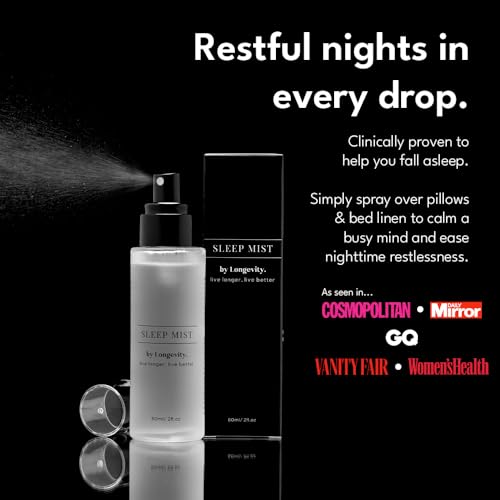Longevity Sleep Mist (60ml) – Natural Pillow Spray with 10 Essential Oils for Deep Sleep – Lavender, Chamomile, Frankincense & More, Toxin-Free, Calming Sleep Spray Pillow Mist for Nightly Use