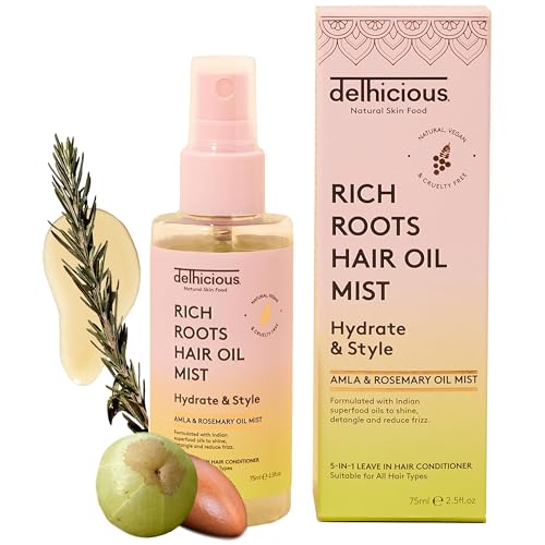 Delhicious 5-in1 Leave in Conditioner Spray, Ayurvedic Hair Oil, Hair Mist – Rich Roots Amla Hair Oil, Argan Oil, Rosemary Oil for Hair – Detangler Spray, Anti Frizz Hair Products – Vegan – 75ml
