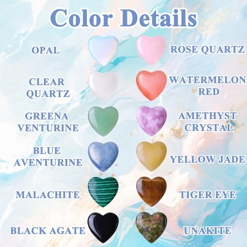 12 Pcs Natural Healing Crystals, Heart Shaped Crystal Art, Worry Stones, Chakra Stones for Meditation, Spiritual Wellness, Thoughtful Present for Women Men, Gemstones Set with Meanings Cards